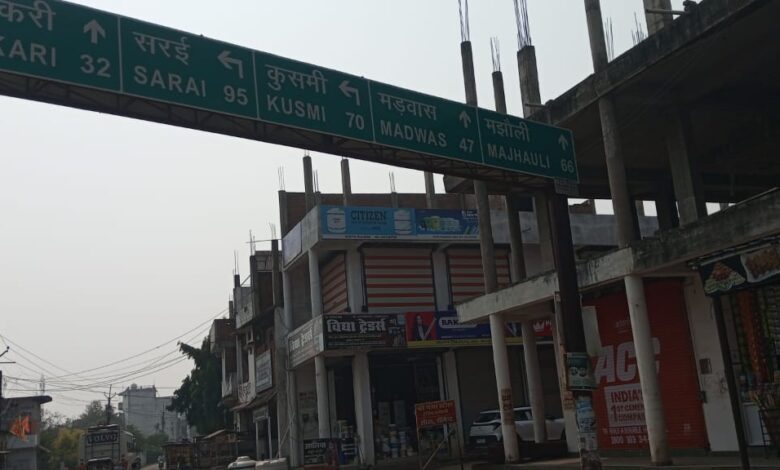 अमहा तिराहे में लगा एनएचआई का बोर्ड दे रहा दुर्घटना को आमंत्रण
