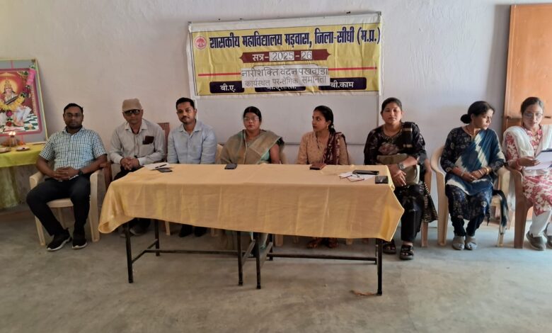 मध्यप्रदेश शासन, उच्च शिक्षा विभाग के निर्देशानुसार शासकीय महाविद्यालय मड़वास में ‘नारी शक्ति वंदन पखवाड़ा’ के अंतर्गत विभिन्न कार्यक्रमों का आयोजन किया गया। दिनांक 15 अप्रैल 2026 को ‘शिक्षा से सशक्तीकरण’ विषय पर निबंध प्रतियोगिता आयोजित की गई, जिसमें पांच प्रतिभागियों ने भाग लिया। वहीं 16 अप्रैल 2026 को “कल की महिला नेतृत्व” विषय पर पोस्टर प्रतियोगिता आयोजित की गई, जिसमें चार प्रतिभागियों ने अपनी प्रतिभा का प्रदर्शन किया। पखवाड़े की अगली कड़ी में 17 अप्रैल 2026 को “कार्यस्थल पर लैंगिक समानता” विषय पर व्याख्यान कार्यक्रम आयोजित किया गया। कार्यक्रम का शुभारंभ मां सरस्वती के समक्ष दीप प्रज्वलन एवं माल्यार्पण के साथ हुआ। विषय परिचय नारी शक्ति वंदन पखवाड़ा की प्रभारी डॉ. निशा सिंह द्वारा कराया गया। मुख्य वक्ता श्रीमती लक्ष्मी ताम्रकार ने कहा कि नारी का जीवन संघर्षों से भरा होता है और यही संघर्ष उसे आगे बढ़ने की प्रेरणा देते हैं। सह वक्ता श्रीमती मानसी चौरसिया ने कहा कि अब समय आ गया है कि समाज से भेदभाव को मन से समाप्त किया जाए। वहीं शिक्षिका श्रीमती आकृति नामदेव ने नारी अधिकारों का समर्थन करते हुए कहा कि अब केवल शब्दों से नहीं, बल्कि कार्यों के माध्यम से आगे बढ़ने की आवश्यकता है। कार्यक्रम की अध्यक्षता महाविद्यालय के प्रभारी प्राचार्य गोपाल चौरसिया ने की। उन्होंने लैंगिक समानता में बाधक रूढ़िवादिता एवं पूर्वाग्रह को समाप्त करने की आवश्यकता पर बल दिया। वरिष्ठ विद्वान डॉ. दीपक अग्निहोत्री एवं तेज प्रताप कुशवाहा ने भी महिला सशक्तीकरण एवं समानता के पक्ष में अपने विचार व्यक्त किए। कार्यक्रम का संचालन डॉ. ज्योति रजक द्वारा किया गया तथा आभार प्रदर्शन डॉ. निशा सिंह ने किया। अंत में उपस्थित वक्ताओं का महाविद्यालय परिवार द्वारा शाल-श्रीफल भेंट कर सम्मान किया गया। इस अवसर पर डॉ. रामधारी जायसवाल, डॉ. राजेश पटेल, डॉ. सुरेंद्र गुप्ता, प्रवीण कुमार, डॉ. राजेश सिंह, अनिल केवट, विकास सेंगर, आरएसजी, अमन पटेल सहित महाविद्यालय के छात्र-छात्राएं उपस्थित रहे।