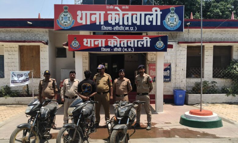 सीधी कोतवाली पुलिस ने नशे की लत पूरी करने के लिए वाहन चोरी करने वाले आरोपी को गिरफ्तार कर 3 मोटरसाइकिलें बरामद करने में बड़ी सफलता पाई है। पुलिस अधीक्षक सीधी संतोष कोरी के निर्देशन, अतिरिक्त पुलिस अधीक्षक अरविंद श्रीवास्तव एवं उप पुलिस अधीक्षक (मुख्यालय) अमन मिश्रा के मार्गदर्शन तथा थाना प्रभारी कोतवाली निरीक्षक अभिषेक उपाध्याय के नेतृत्व में कोतवाली पुलिस ने वाहन चोरी की गुत्थी सुलझाने में महत्वपूर्ण सफलता प्राप्त की है। पुलिस के अनुसार दिनांक 18 अप्रैल 2026 को फरियादी रोहित गुप्ता एवं हुकुमलाल केवट ने रिपोर्ट दर्ज कराई कि 17 अप्रैल 26 एवं 18 अप्रैल 26 की दरमियानी रात अज्ञात चोरों द्वारा उनकी तीन मोटरसाइकिलें (होंडा हॉरनेट, हीरो पैशन प्रो एवं हीरो एनएक्सजी) चोरी कर ली गई हैं। रिपोर्ट पर तत्काल अपराध पंजीबद्ध कर विवेचना में लिया गया।पुलिस कार्रवाई एवं पूंछताछ का तरीका- विवेचना के दौरान कोतवाली पुलिस ने घटना स्थल के आसपास के वीडियो फुटेज खंगाले और मुखबिर तंत्र को सक्रिय किया। साक्ष्यों के आधार पर पुलिस ने एक संदिग्ध अखिलेश विश्वकर्मा पिता हीरालाल विश्वकर्मा उम्र 21 वर्ष निवासी बैरीहा को चिन्हित कर हिरासत में लिया शुरुआती पूंछताछ में आरोपी पुलिस को गुमराह करने के लिए लगातार टालमटोल करता रहा और घटना से अनभिज्ञता जताता रहा। किंतु जब पुलिस ने तकनीकी साक्ष्य सामने रखे और कड़ाई से पूंछताछ की, तो आरोपी टूट गया और उसने अपना जुर्म स्वीकार कर लिया। आरोपी ने पूंछताछ में खुलासा किया कि वह नशे का आदी है। अपनी नशे की लत और महंगे शौक पूरे करने के लिए उसके पास पैसे नहीं थे, जिसकी पूर्ति के लिए उसने वाहनों की चोरी करना शुरू किया। वह इन वाहनों को बेचकर प्राप्त राशि से नशा करता था।आरोपी से बरामद मशरूका -आरोपी की निशानदेही पर पुलिस ने चोरी की गई तीनों मोटरसाइकिलें बरामद की हैं। होंडा हॉरनेट एमपी 53 एमसी 9621 कीमती लगभग 60 हजार रूपए , हीरो पैशन प्रो एमपी 53 एमजे 3657 कीमती लगभग 50 हजार रूपए , हीरो एनएक्सजी एमपी 53 एमडी 3928 कीमती लगभग 50 हजार रूपए शामिल है। जप्त की गई तीनों मोटरसाइकिलों की कीमत लगभग 1लाख 60 हजार रूपए हैं। अग्रिम कार्रवाई एवं टीम-प्रकरण में अन्य आरोपियों की संलिप्तता के संबंध में तलाश जारी है। इस सराहनीय कार्य में निरीक्षक अभिषेक उपाध्याय, उप निरीक्षक विवेक द्विवेदी, प्रआर रण बहादुर सिंह, सूरज सिंह एवं आरक्षक अनुराग यादव की विशेष भूमिका रही।